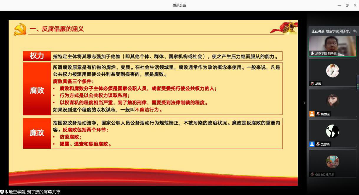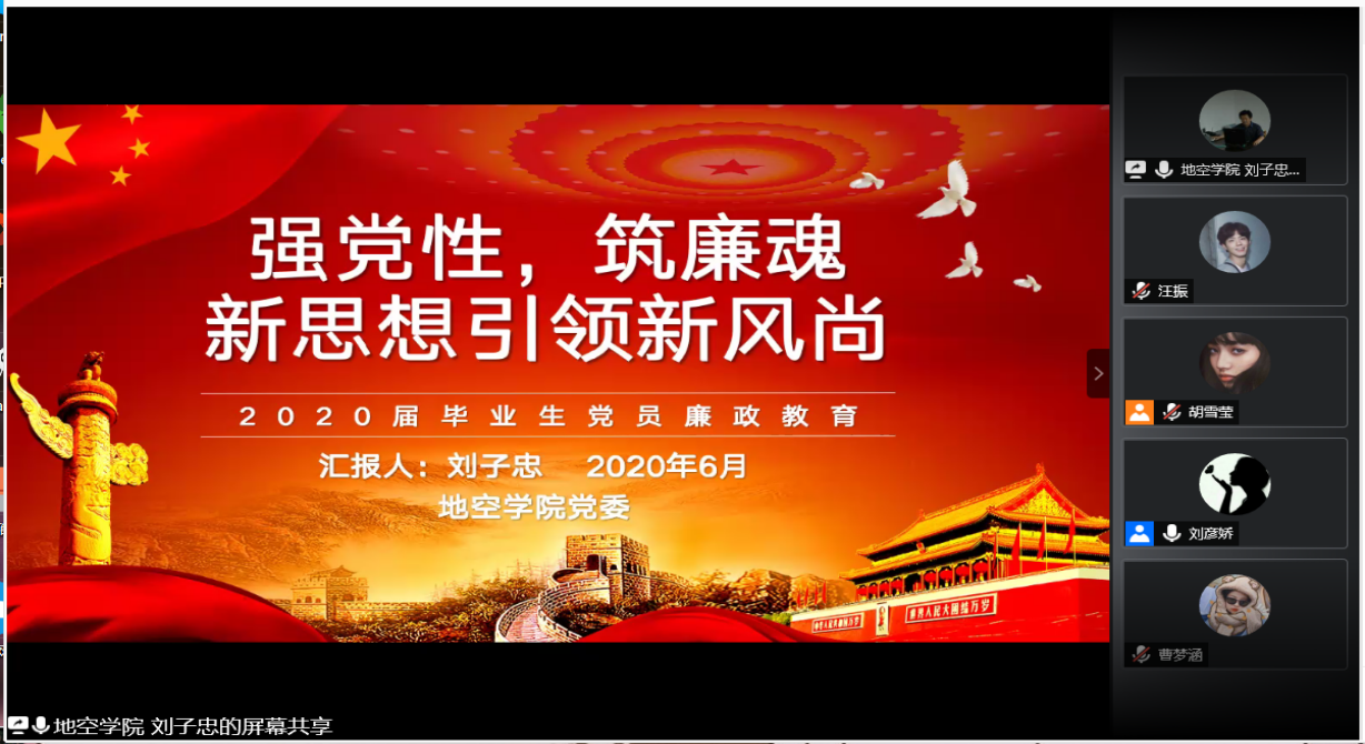 (通讯员刘彦娇 汪振)在2020届毕业生即将离校之际, 为深入学习贯彻习近平新时代中国特色社会主义思想和党的十九大精神,贯彻落实全国高校思想政治工作会议精神,紧紧围绕立德树人根本任务,积极培育和践行社会主义核心价值观,进一步引导毕业生廉洁修身,走好迈向社会的第一步,公司党委于6月24日晚19:30通过腾讯会议平台组织公司全体毕业生党员进行党员廉政教育。课程由公司党委书记刘子忠主讲,辅导员刘彦娇主持。