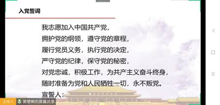 九点四十五,活动正式开始,首先XC体育(武汉)地探专业硕士研究生纵向党支部支部书记郭楚枫带领大家唱国歌,重温入党誓词。