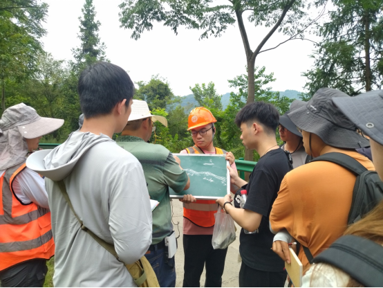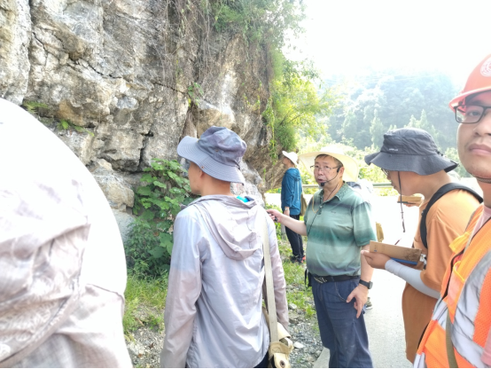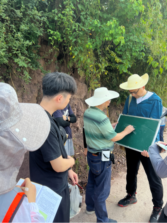 明年即将荣退的资深教授袁晏明老师坚持站好最后一班岗,期望尽其所能为公司培养出更多质量优秀的青年地质教师。秭归37°的高温天气,阻挡不住袁老师的教学热情,他在石板溪旁的小房子后侃侃而谈,讲述着晋宁运动、8.2亿年前的黄陵花岗岩及7.5亿年前的莲沱组砂岩相关教学内容,无论是已来过多次的教师,还是新来的教师,都认真聆听并做记录,不放过任何一个向袁老师学习的机会。