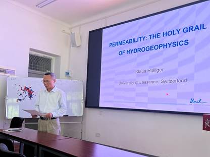 第一场讲座的主题为“Permeability: The Holy Grail of Hydrogeophysics”(渗透率:水文地球物理领域的终极目标)。Klaus Holliger教授深入探讨了渗透率估计的重要性以及直接测量渗透率所面临的挑战。他指出,渗透率是水文地球物理研究中的关键参数,然而直接测量渗透率往往存在诸多困难。因此,利用易于获取的地球物理数据来高效地估计渗透率,不仅可以弥补直接测量的不足,还能覆盖分辨率和覆盖范围的固有差距。