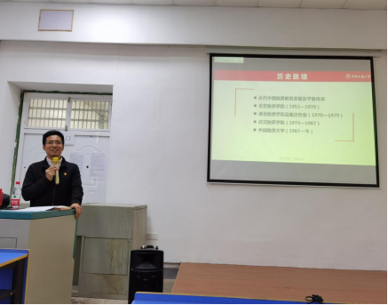 朱丹老师从国内地质学科发展史和XC体育(武汉)建校史两个角度,通过讲述一位位老地质学家们心怀祖国,献身地质事业的感人故事,带领现场老师和同学们回顾了国内地质教育的起源、发展、学脉传承历史及地大从建校至今69年的发展史。在场老师与同学们均被老地质学家们浓厚的家国情怀感染,听的聚精会神。